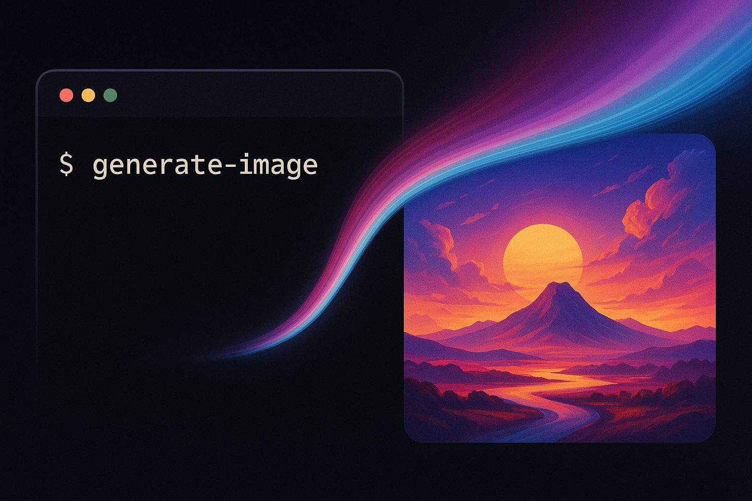 ターミナルのコマンド操作から鮮やかな生成画像が立ち上がる様子を描いた、CLIベースの画像生成をイメージしたテックビジュアル
